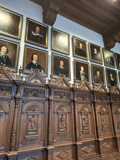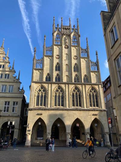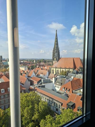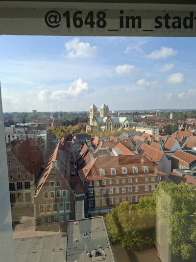 Nun ging es zum Friedenssaal im Historischen Rathaus mit einer 15minütigen Audioführung. Es folgte eine 2stündige Freizeit, in der wir auf Erkundungstour gingen. Interessant war u.a. das inklusive Cafe 1648 mit Panoramablick über Münster und die Lambertikirche, an deren Turm die Eisenkäfige hängen, in denen die Leichen der Wiedertäufer 1536 ausgestellt wurden.